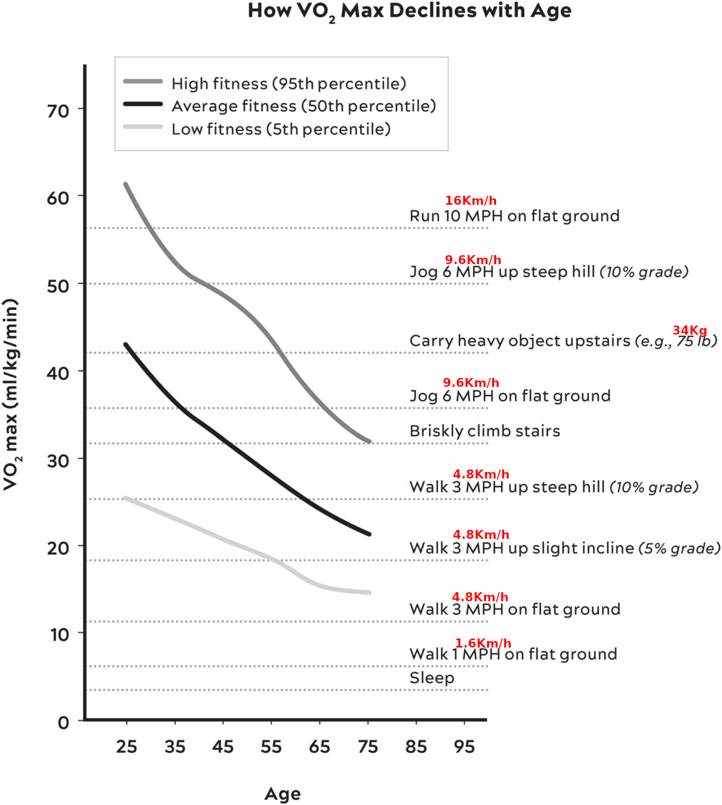 (6) Based on data from: "Association of Cardiorespiratory Fitness With Long-term Mortality Among Adults Undergoing Exercise Treadmill Testing" Kyle Mandsager, Serge Harb, Paul Cremer, Dermot Phelan, Steven E Nissen, Wael Jaber. Using MET equaling ~3.5mL/Kg per minute of oxygen consumption.