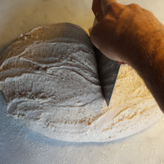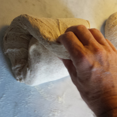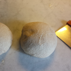 After the dough has raised, pull it careful out of the bowl onto a floured table, try not to brake the the structure of the dough. Divide the dough into 2, and bend each part 3 times over itself. Form two balls very carefully, try to keep the structure of the dough.