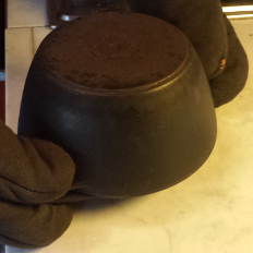 Put the dough carefully into the bottom part of the dutch oven. Cut the dough with a razorblade. Cover the dough with the top part of the dutch oven.