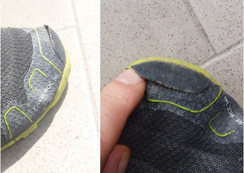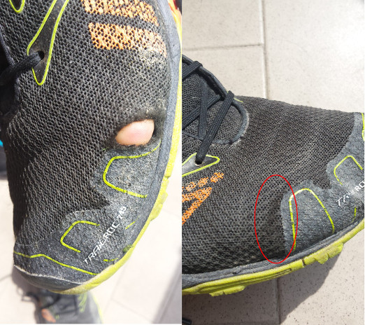 The toe cap of the right shoe has given away, see picture 2. This is something I normal only see on much cheaper shoes, and my opinion is that Inov-8 has a glue problem here, to me it look likes, that also the left shoe will have this problem shortly.