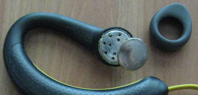 When I took the left ear-gel of, I got my first indication to why the headset failed. The grid, in front of the speaker, fell off (see picture 2).