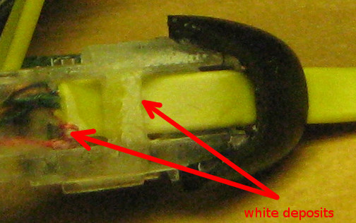 A near look at the right part, there contains the electronics (see picture 6), shows some white deposits. To me it look like salt, properly from my sweat (see picture 7), this is concentrated around the wire initiation. The rest of the electronics looks healthy. I suspect this salt deposits shows that humidity has entered the electronics and provoked the failure of the headset.