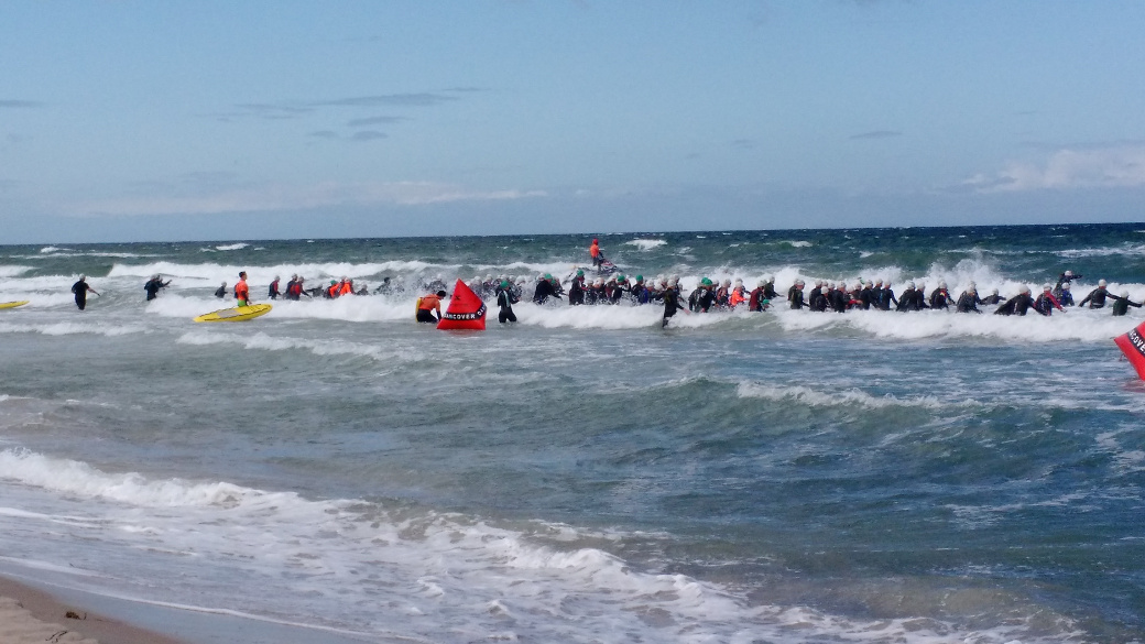Before start. Everybody seems worry for the huge waves (it's me there to the right with the blue goggles, looking for a good sport to start from)